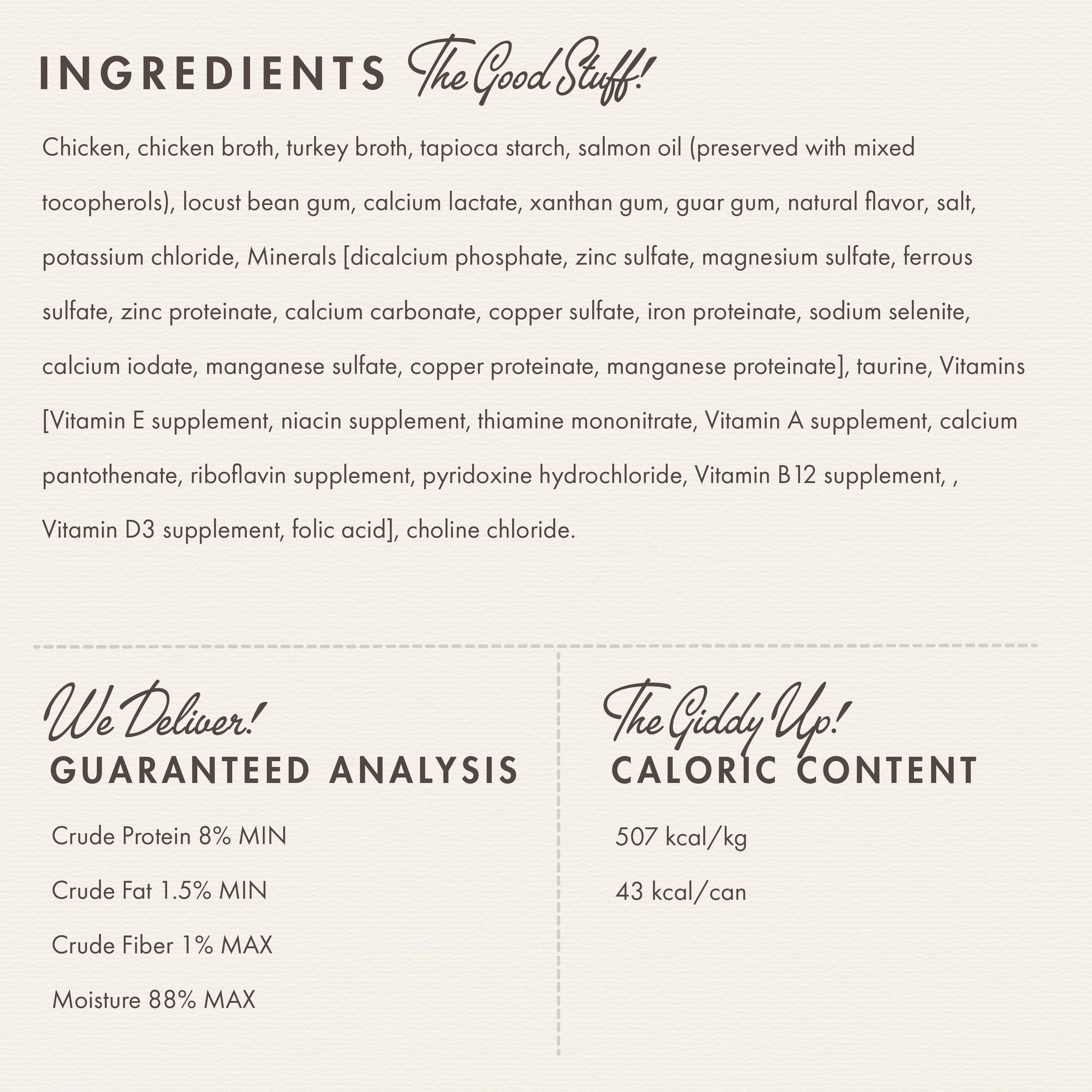 Hearty shredded chicken suspended in a flavorful gelée made with chicken and turkey broth.